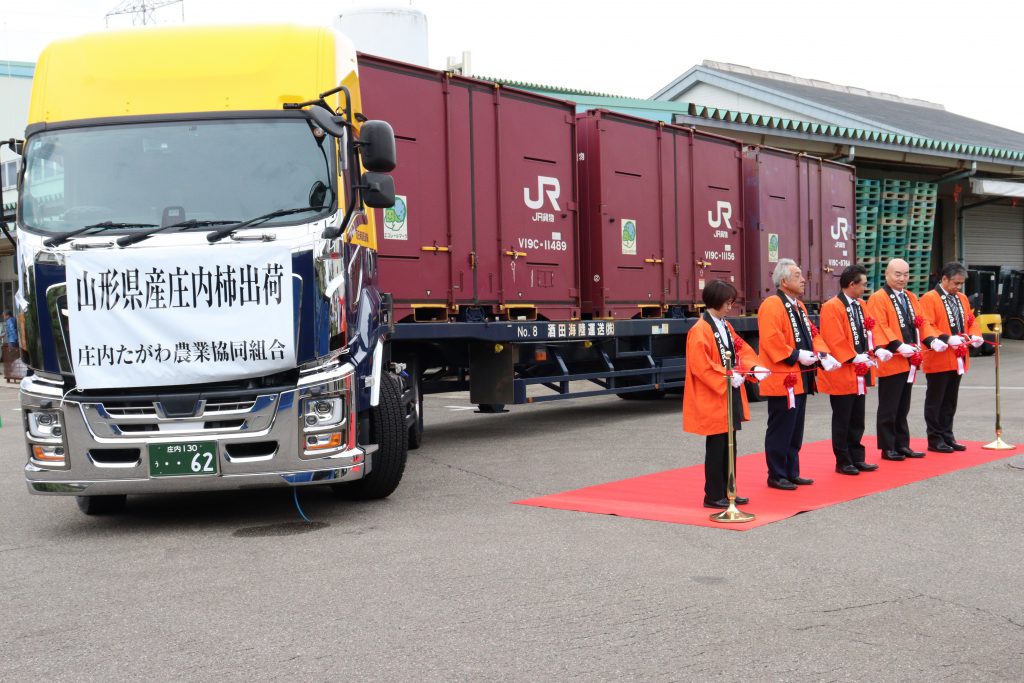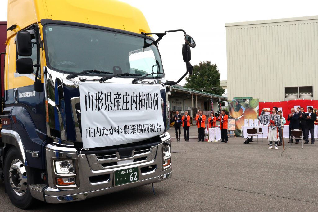 神事やテープカットを執り行った後、参加者らの拍手に包まれ1800ケース(約15㌧)の『庄内柿』を積んだトラックが主要消費地である北海道へ出発しました。